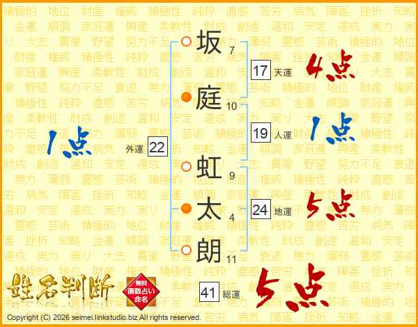 坂庭虹太朗さんの総運は41画の5点!