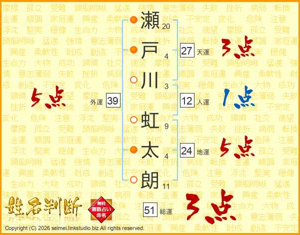 瀬(20画)戸(4画)川(3画) 虹(9画)太(4画)朗(11画)