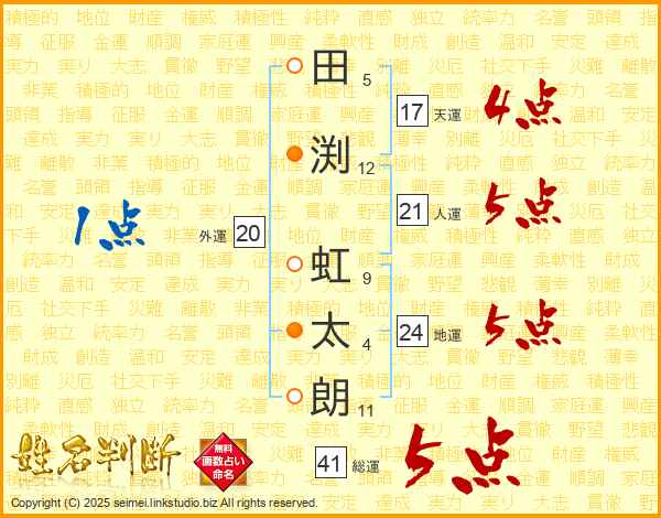 田(5画)渕(12画) 虹(9画)太(4画)朗(11画)