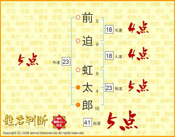前(9画)迫(9画) 虹(9画)太(4画)郎(10画)