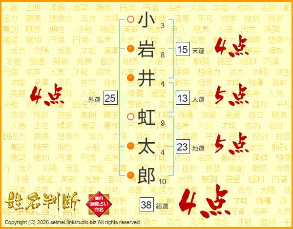 小(3画)岩(8画)井(4画) 虹(9画)太(4画)郎(10画)