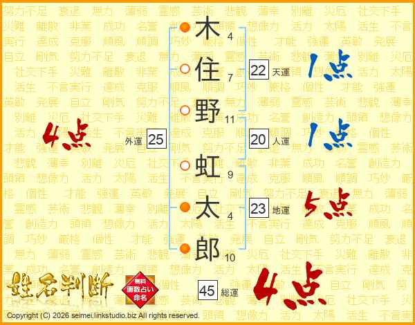 木(4画)住(7画)野(11画) 虹(9画)太(4画)郎(10画)