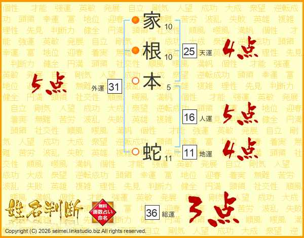 家系が持つ宿命的な運勢を表します。祖先から受け継いだ苗字ですので自分の力が及びません。家柄を象徴します。苗字の合計画数。