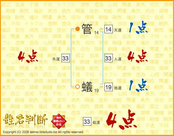 生活面を象徴する運勢です。外部から受ける影響力を表し、結婚運、家庭運や職場、環境への順応性を表します。総運から人運を引いた画数。姓や名が1文字の場合を除く。