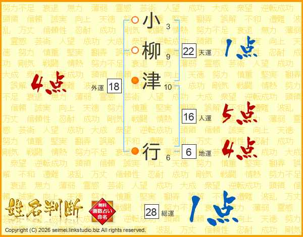 生活面を象徴する運勢です。外部から受ける影響力を表し、結婚運、家庭運や職場、環境への順応性を表します。総運から人運を引いた画数。姓や名が1文字の場合を除く。