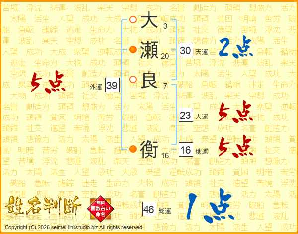 大(3画)瀬(20画)良(7画) 衡(16画)