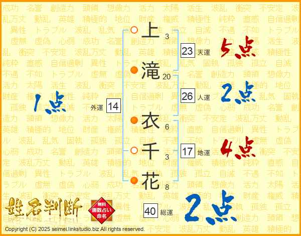上(3画)滝(20画) 衣(6画)千(3画)花(8画)