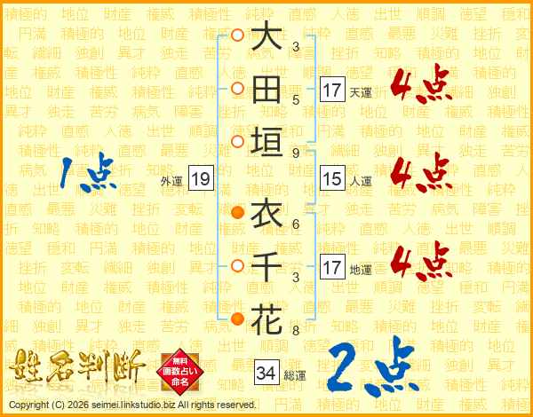大(3画)田(5画)垣(9画) 衣(6画)千(3画)花(8画)