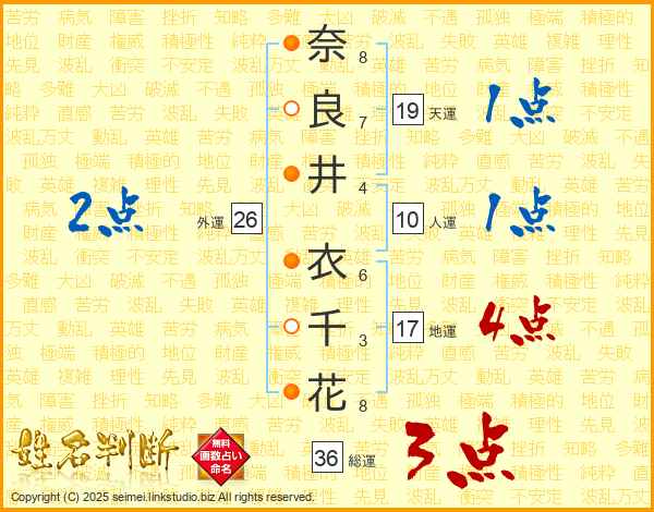 奈(8画)良(7画)井(4画) 衣(6画)千(3画)花(8画)