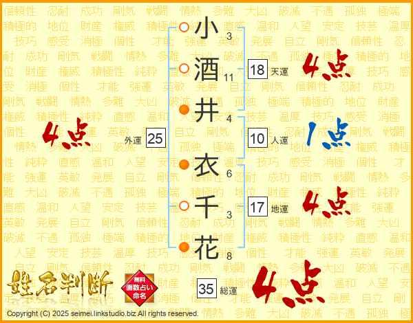 あなたの人生を表す1番重要な運勢です。生涯を通じて影響する総合運となり、主に50歳以降の晩年期に影響を及ぼします。苗字と名前の合計画数。