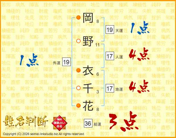 岡(8画)野(11画) 衣(6画)千(3画)花(8画)