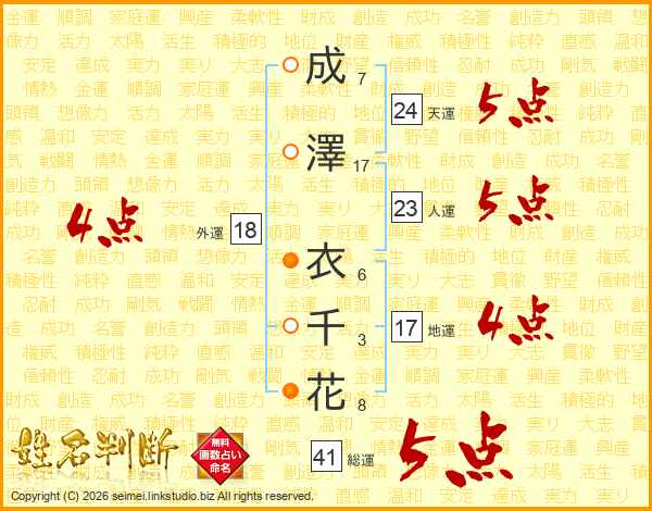 成澤衣千花さんの総運は41画の5点!