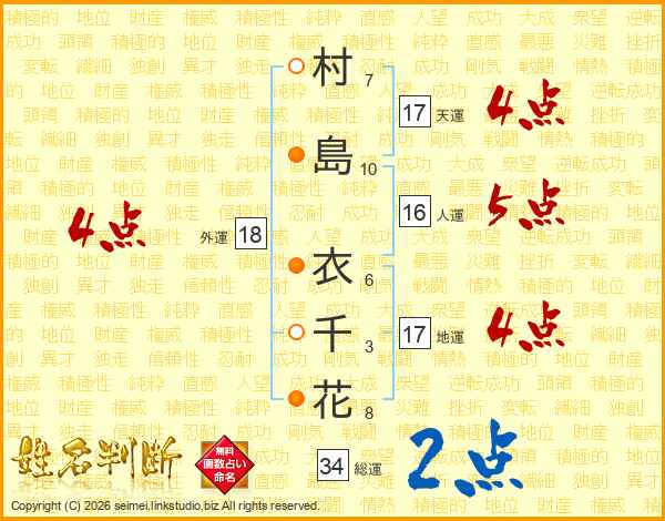 村(7画)島(10画) 衣(6画)千(3画)花(8画)