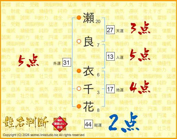 瀬(20画)良(7画) 衣(6画)千(3画)花(8画)