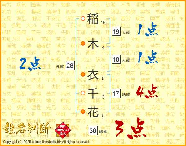 稲(15画)木(4画) 衣(6画)千(3画)花(8画)
