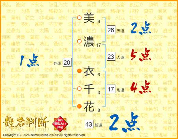 美(9画)濃(17画) 衣(6画)千(3画)花(8画)