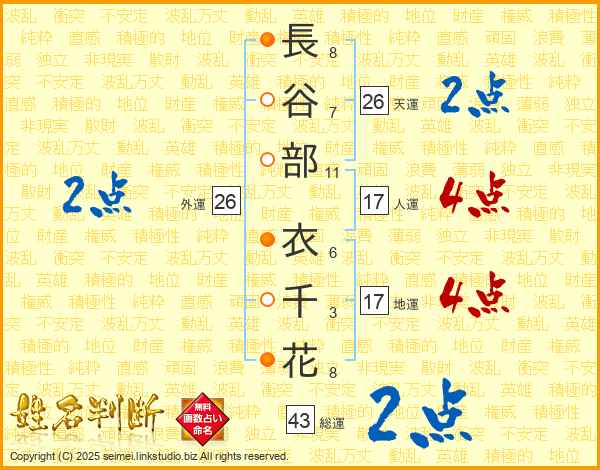長(8画)谷(7画)部(11画) 衣(6画)千(3画)花(8画)