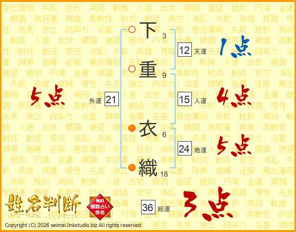 生活面を象徴する運勢です。外部から受ける影響力を表し、結婚運、家庭運や職場、環境への順応性を表します。総運から人運を引いた画数。姓や名が1文字の場合を除く。