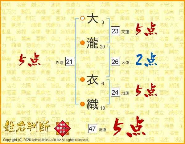 大(3画)瀧(20画) 衣(6画)織(18画)