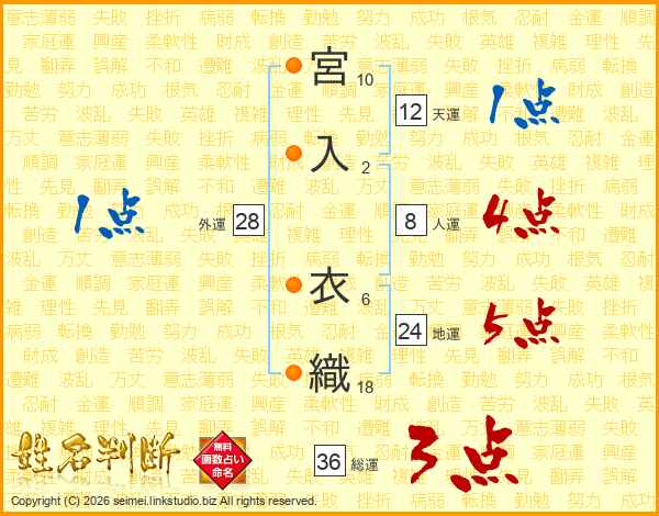 生活面を象徴する運勢です。外部から受ける影響力を表し、結婚運、家庭運や職場、環境への順応性を表します。総運から人運を引いた画数。姓や名が1文字の場合を除く。
