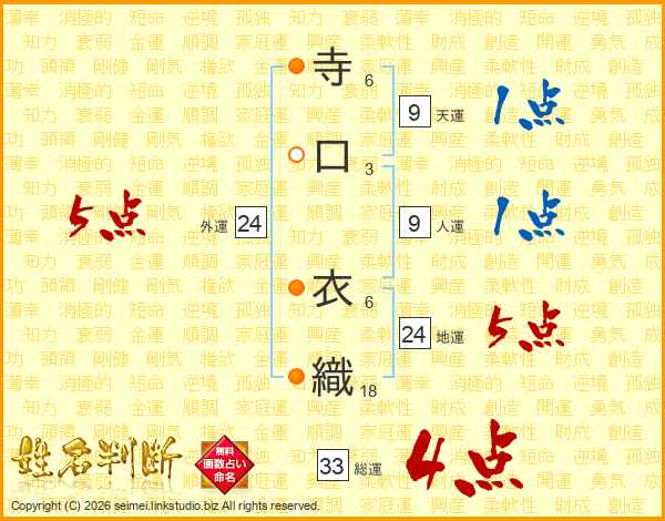 生活面を象徴する運勢です。外部から受ける影響力を表し、結婚運、家庭運や職場、環境への順応性を表します。総運から人運を引いた画数。姓や名が1文字の場合を除く。