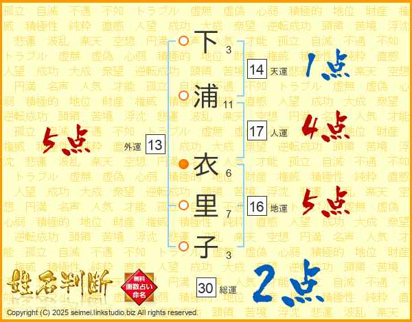 下(3画)浦(11画) 衣(6画)里(7画)子(3画)