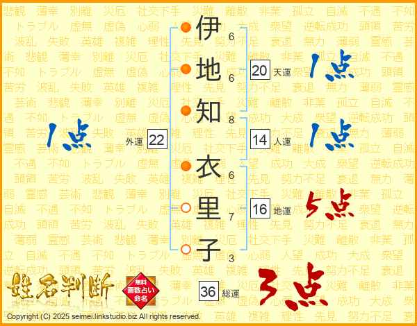 伊(6画)地(6画)知(8画) 衣(6画)里(7画)子(3画)