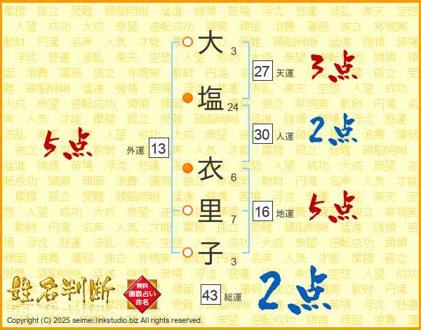 大(3画)塩(24画) 衣(6画)里(7画)子(3画)