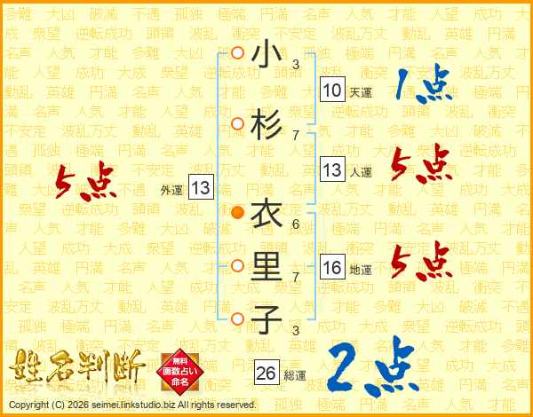 小杉衣里子さんの総運は26画の2点!