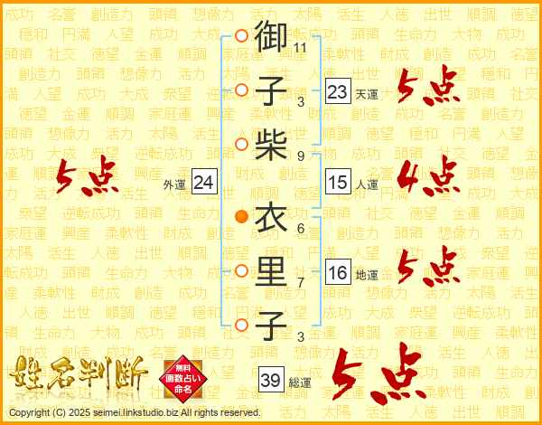 御(11画)子(3画)柴(9画) 衣(6画)里(7画)子(3画)