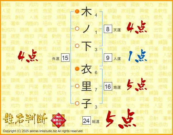 木(4画)ノ(1画)下(3画) 衣(6画)里(7画)子(3画)