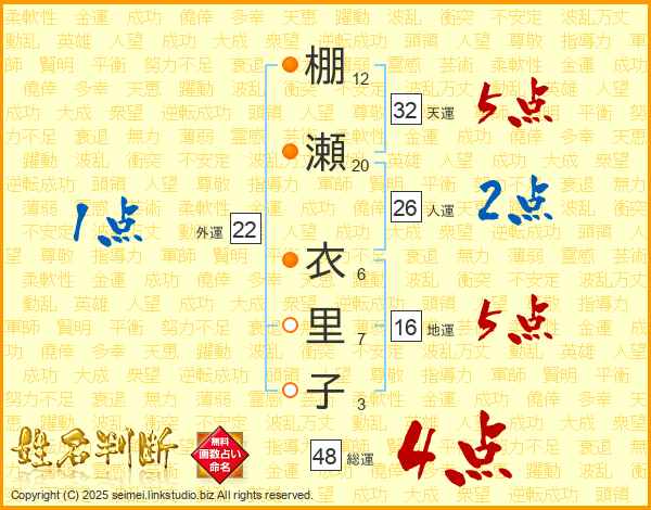 棚(12画)瀬(20画) 衣(6画)里(7画)子(3画)