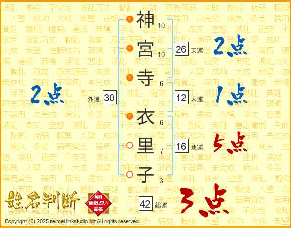 神(10画)宮(10画)寺(6画) 衣(6画)里(7画)子(3画)