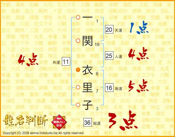 一(1画)関(19画) 衣(6画)里(7画)子(3画)