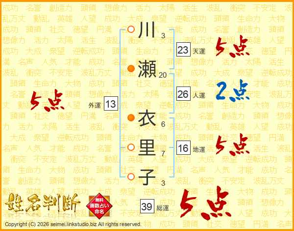 川瀬衣里子さんの総運は39画の5点!