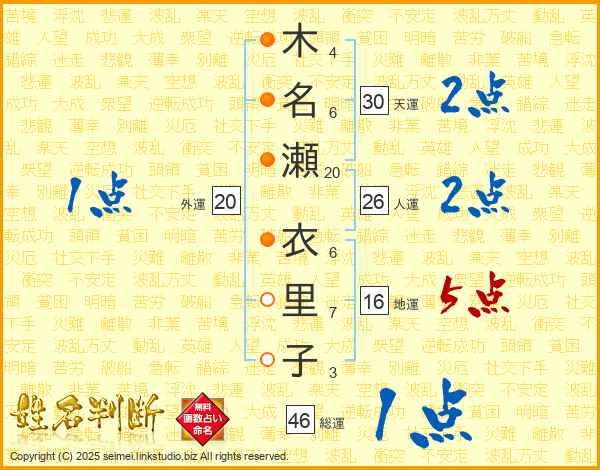 木(4画)名(6画)瀬(20画) 衣(6画)里(7画)子(3画)