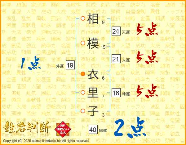 生活面を象徴する運勢です。外部から受ける影響力を表し、結婚運、家庭運や職場、環境への順応性を表します。総運から人運を引いた画数。姓や名が1文字の場合を除く。