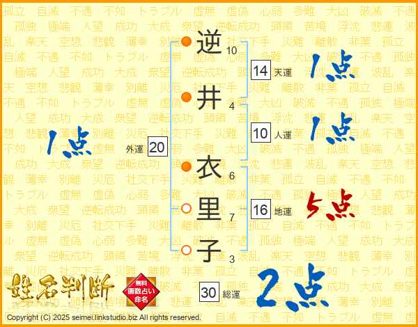 逆(10画)井(4画) 衣(6画)里(7画)子(3画)