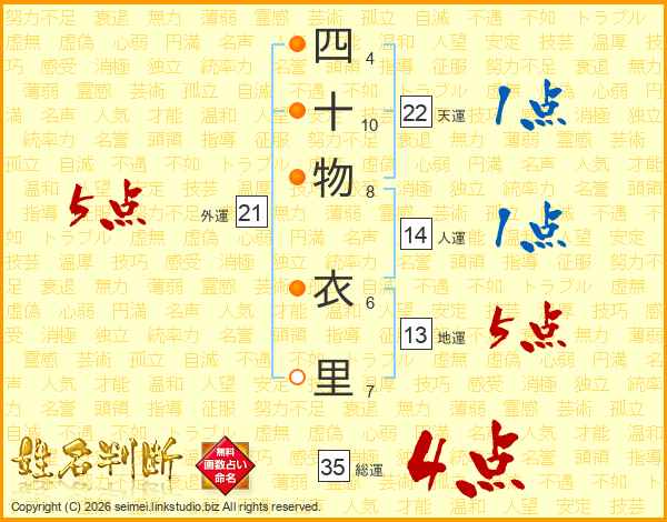 生活面を象徴する運勢です。外部から受ける影響力を表し、結婚運、家庭運や職場、環境への順応性を表します。総運から人運を引いた画数。姓や名が1文字の場合を除く。