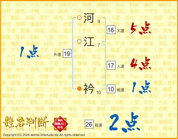 生活面を象徴する運勢です。外部から受ける影響力を表し、結婚運、家庭運や職場、環境への順応性を表します。総運から人運を引いた画数。姓や名が1文字の場合を除く。