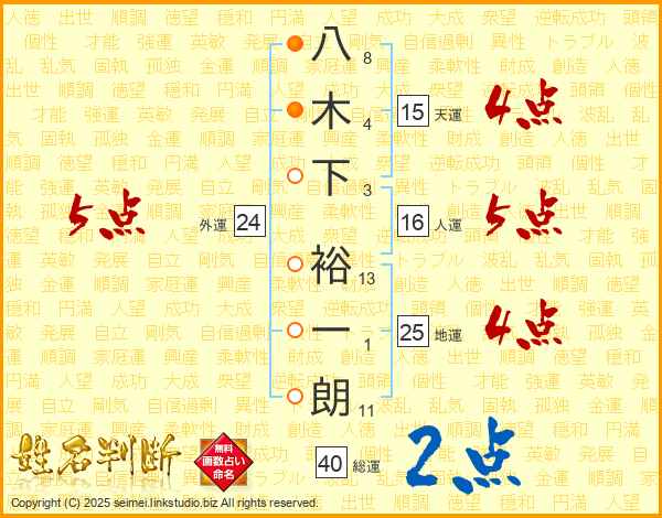 八(8画)木(4画)下(3画) 裕(13画)一(1画)朗(11画)