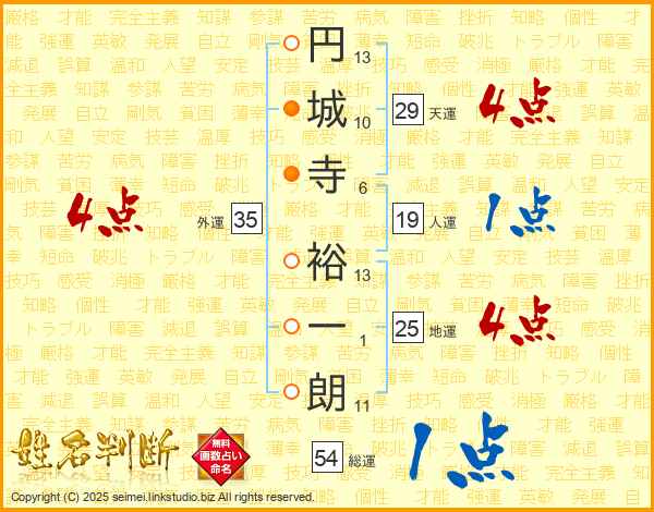 円(13画)城(10画)寺(6画) 裕(13画)一(1画)朗(11画)