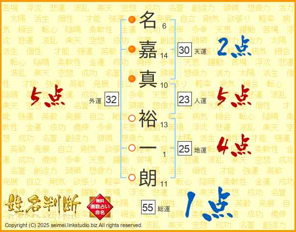 名(6画)嘉(14画)真(10画) 裕(13画)一(1画)朗(11画)