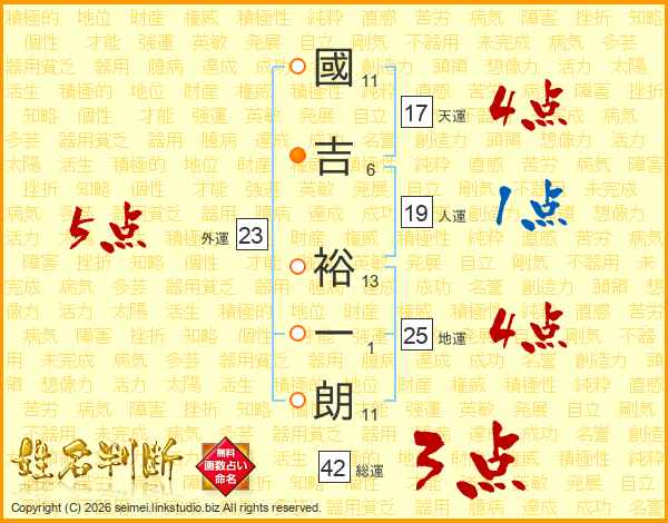 國(11画)吉(6画) 裕(13画)一(1画)朗(11画)
