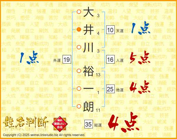 大(3画)井(4画)川(3画) 裕(13画)一(1画)朗(11画)