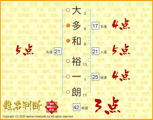 大(3画)多(6画)和(8画) 裕(13画)一(1画)朗(11画)