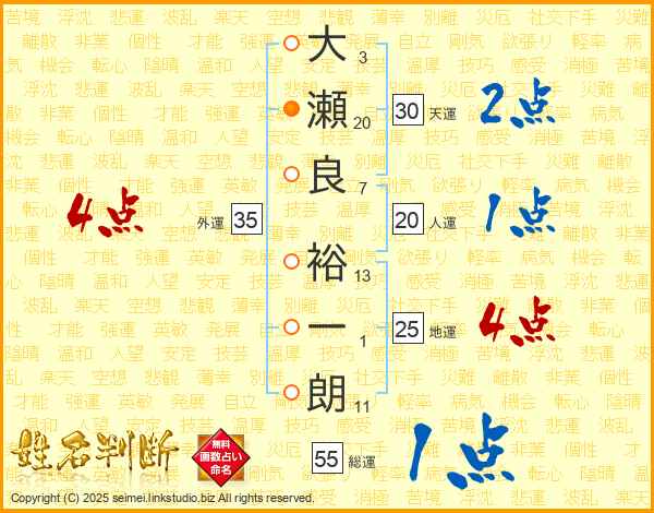 大(3画)瀬(20画)良(7画) 裕(13画)一(1画)朗(11画)