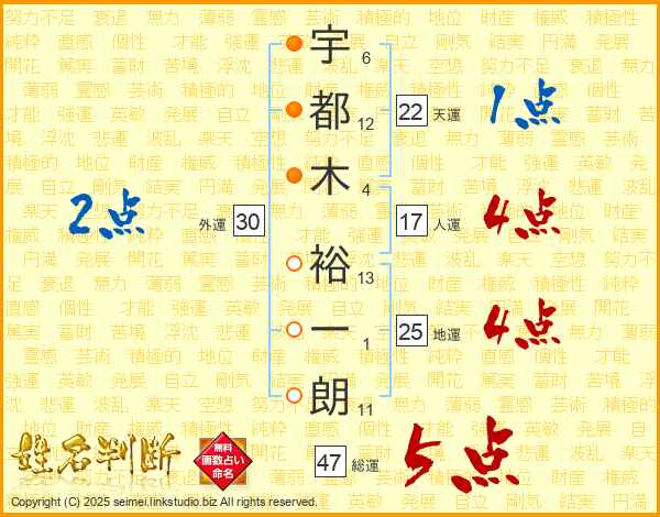 宇(6画)都(12画)木(4画) 裕(13画)一(1画)朗(11画)