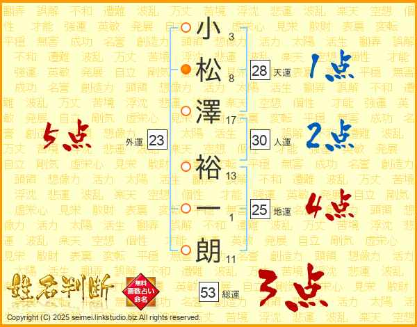 小(3画)松(8画)澤(17画) 裕(13画)一(1画)朗(11画)