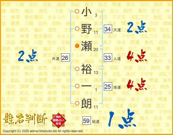 小(3画)野(11画)瀬(20画) 裕(13画)一(1画)朗(11画)